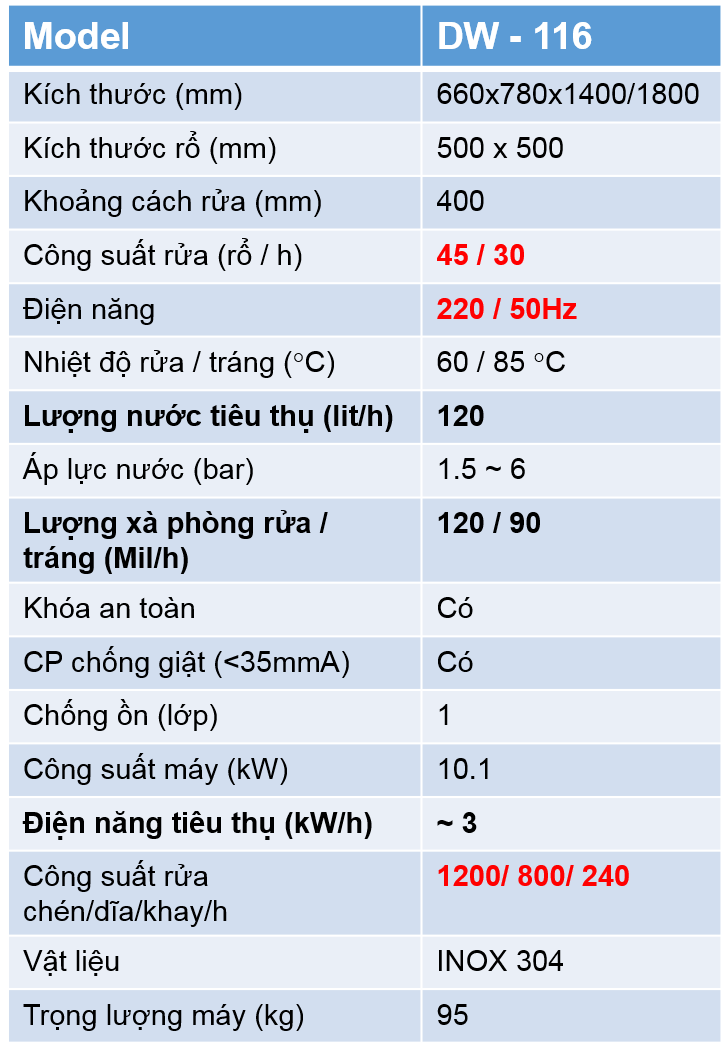 Công suất rửa (dĩa/h): ~ 1200chén/h (~240 khay/h)