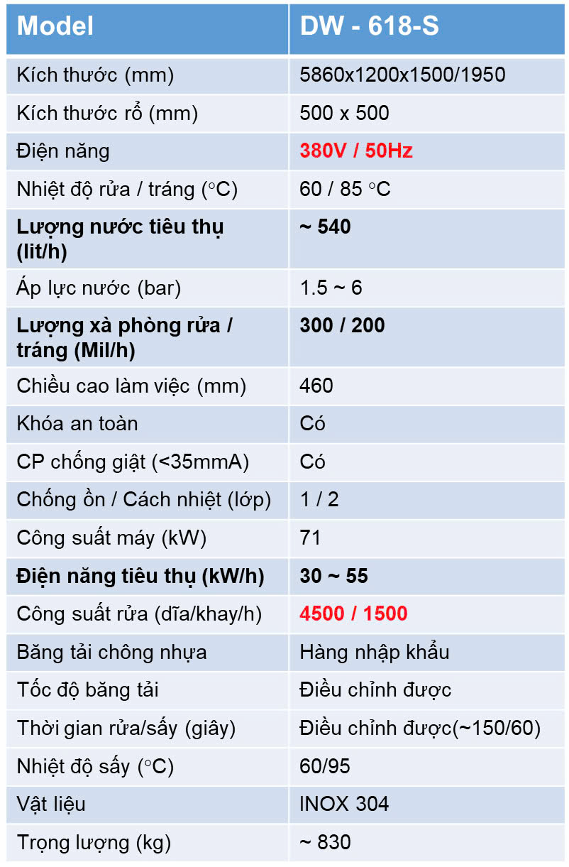 Công suất rửa (dĩa/h): ~ 4500 chén/h (~1500 khay/h)