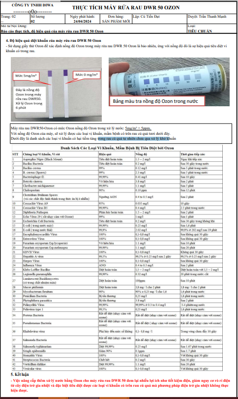 Nồng độ Ozon trong nước ≈5mg/m3.
