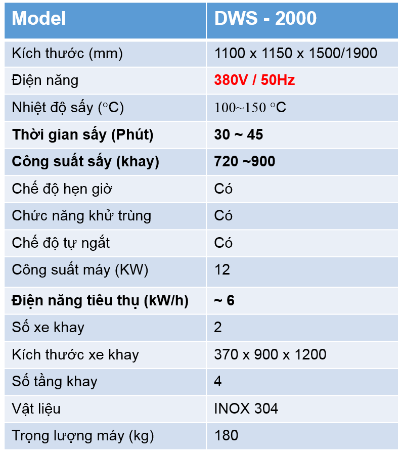 - Máy sấy khay DWS-2000 là loại máy sấy có công suất 900 khay / mẻ, sấy trong 30 ~ 45 phút - Thích hợp cho Suất Ăn Công Nghiệp, căn tin, nhà ăn,... từ 2000 đến 10,000 suất ăn.